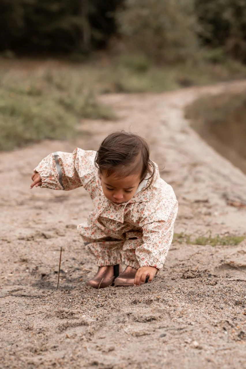 Der wasserdichte Celavi Regenanzug in creme hat ein süßes Blümchen Motiv. Durch den bequemen Schnitt ist der Anzug ganz einfach anzuziehen. Rein in den Matschoverall, und Raus in die Natur. Die gute Paßform sorgt dafür, daß die Kleinen sich nicht eingeengt fühlen und nichts zwickt oder drückt. Verschweißte Nähte und der abgedeckte Reißverschluss halten Regen und Matsch draußen. Der Regenanzug ist ungefüttert . Mit einem wärmenden Fleeceoverall darunter ist er auch im Winter ein zuverlässiger Schutz vor Nässe, Matsch und Kälte.
