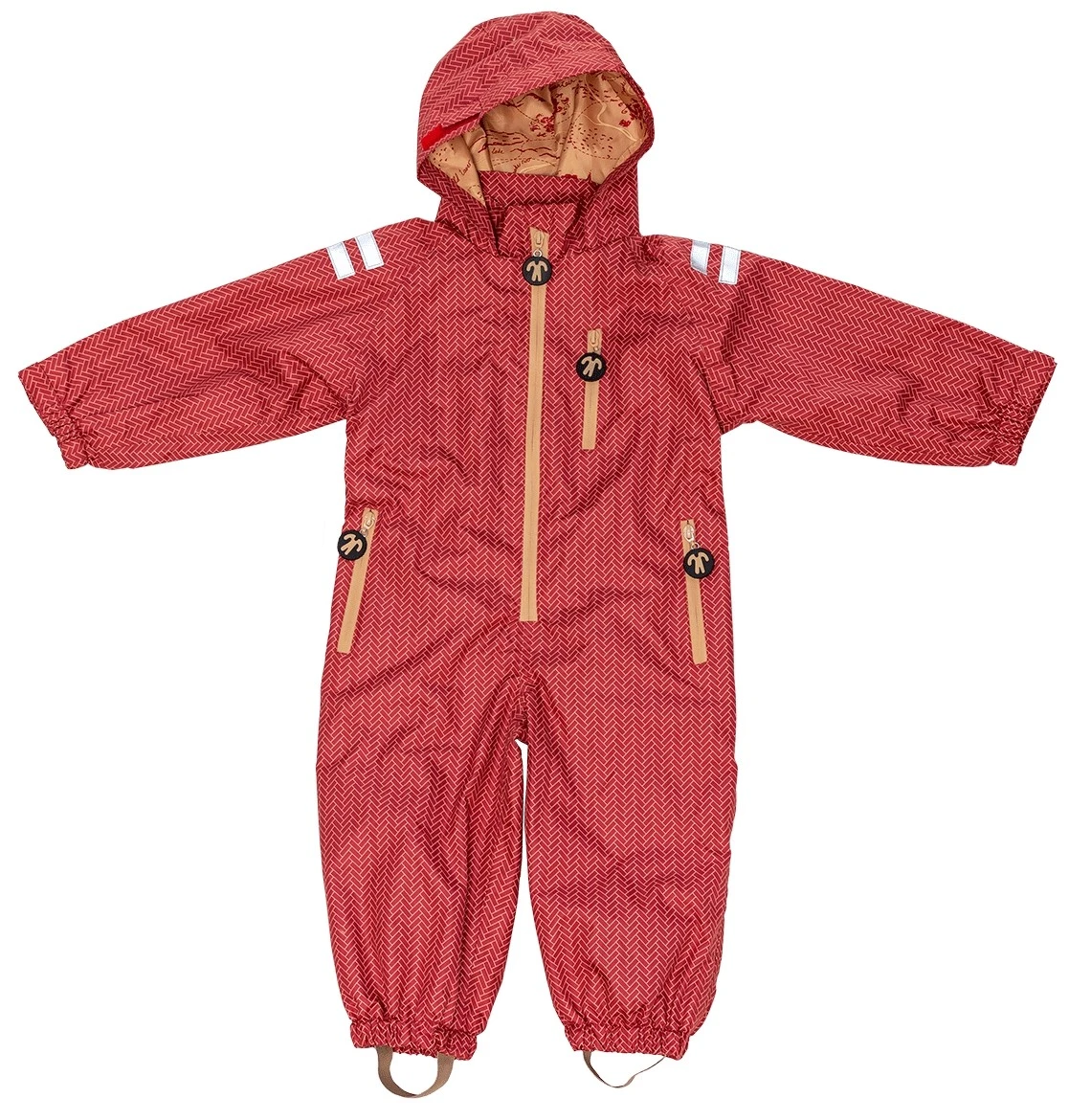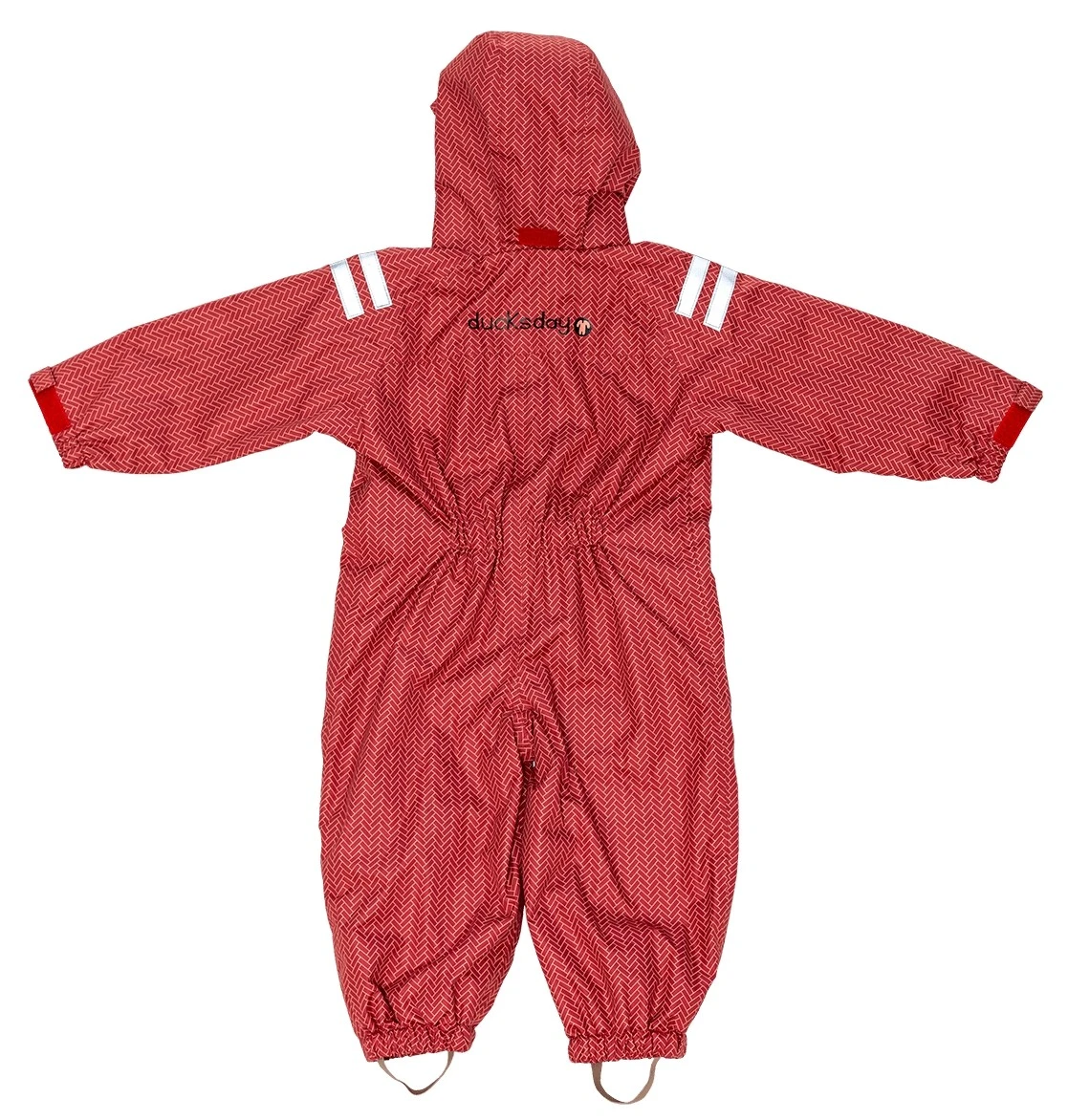 Praktischer wasserdichter Matschoverall von Ducksday. Der Regenanzug Wick hat ein schönes grafisches Muster in ziegelrot. Der ideale Regenoverall zum Drüberziehen als Schmutz und Nässeschutz für den Spielplatz, Sandkasten, Kindergarten oder zum Fahrradfahren.