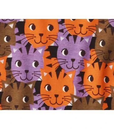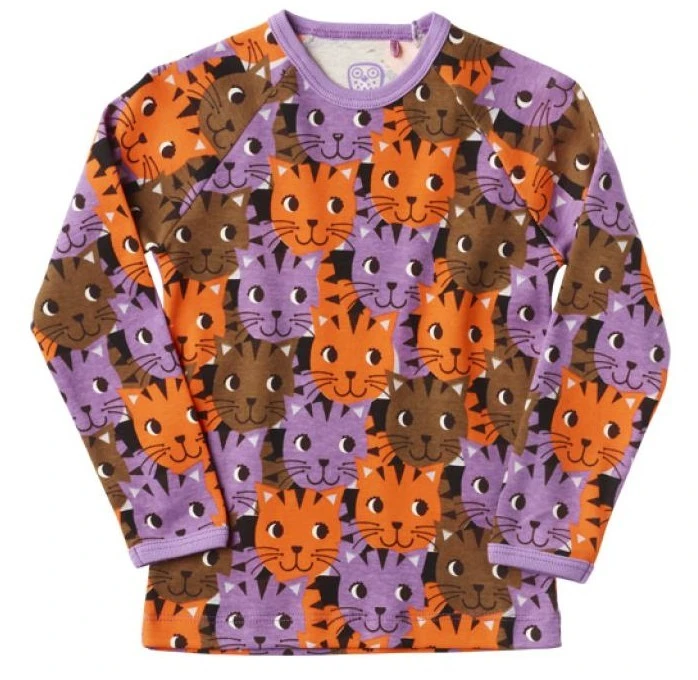 Eine ganze Horde süßer kleiner Kätzchen ist das Motiv auf dem schönen Langarm Shirt für Kinder. Sehr gelungene Farbkombi aus violett mit orange und braun.
