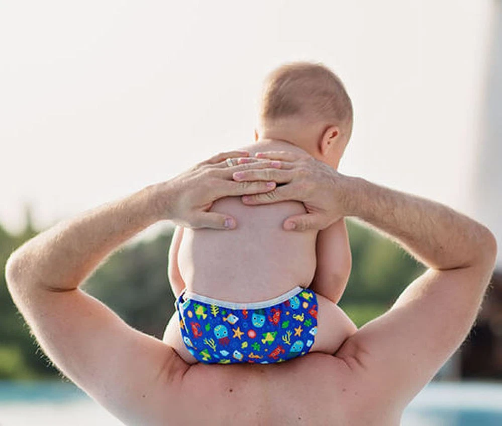 Atmungsaktive wiederverwendbare Baby Schwimmwindel in blau mit Meersetieren und Fischen