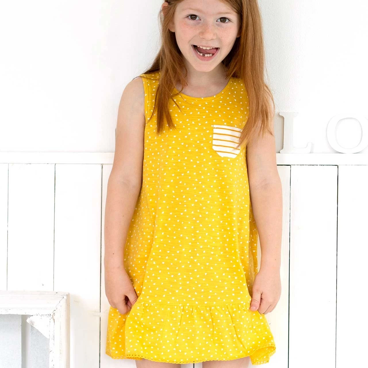 Luftiges Mädchen Jerseykleid in maisgelb mit kleinem Dreieck-Print. Das Material ist 100% Baumwolle , kontrolliert biologischer Anbau, „organic“ gem. GOTS lizenziert durch Ecocert Greenlife | Liz. Nr. 151811. Hergestellt aus Bio-Baumwolle in Ägypten beim Textilunternehmen der Kulturinitiative SEKEM.