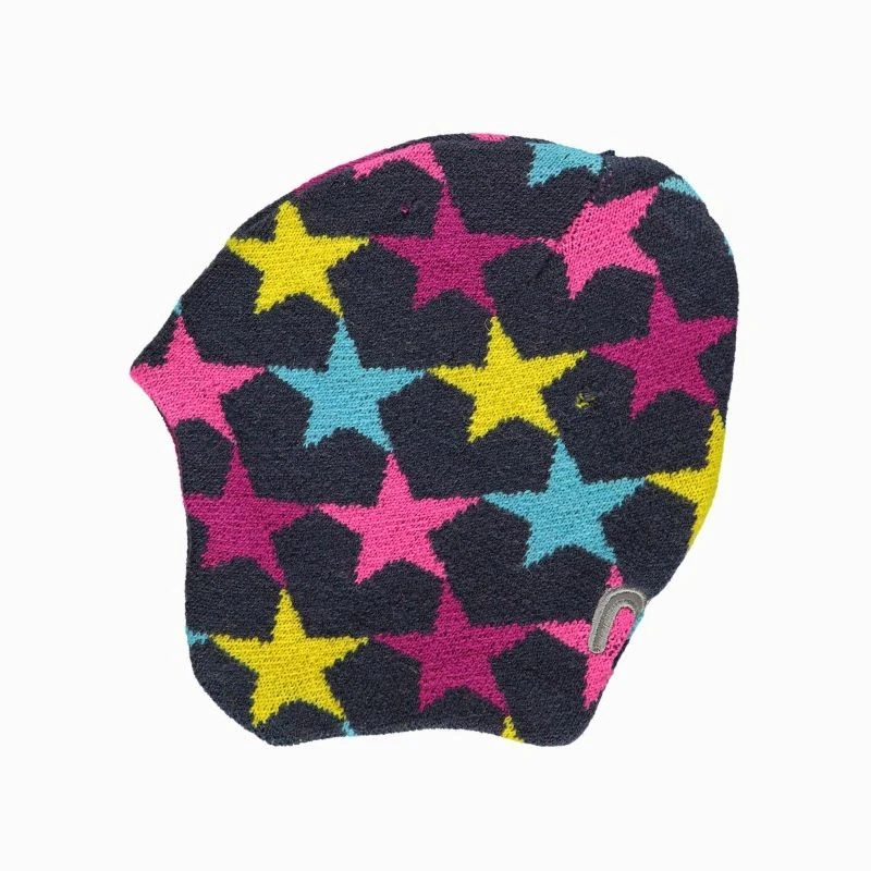 praktische und kuschelwarme und nicht kratzende Mütze aus gestrickter Schurwolle mit nicht kratzendem Innenfutter. Modell Thunder49 in der Farbe dunkelblau mit aqua blau, hellblau , pinken und gelben Sternen. Paßt farblich prima zu den Minymo Winterjacken, Skihosen und Schneeanzügen.